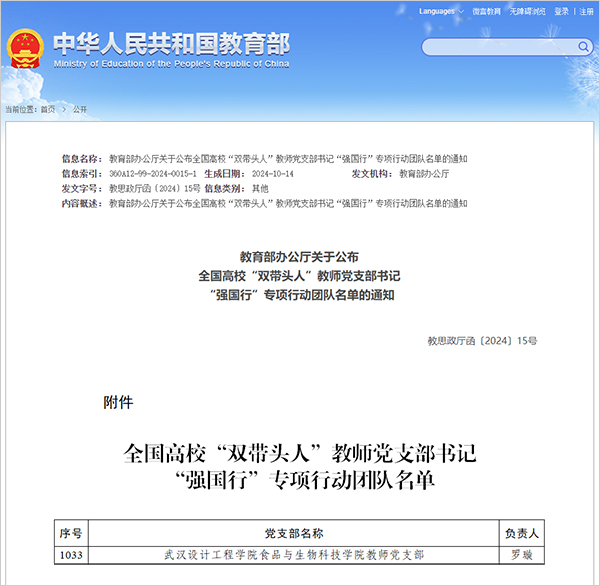 pp电子食品与生物科技学院教师党支部入选全国高校“双带头人”教师党支部书记“强国行”专项行动团队。