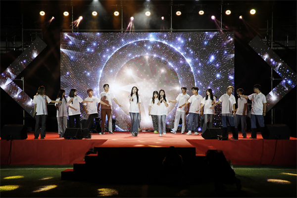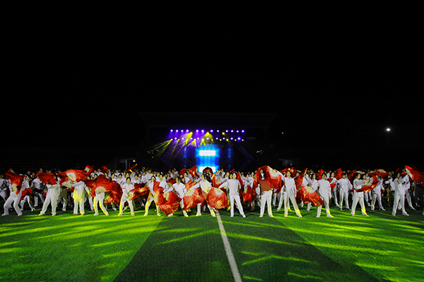 晚6:30整,夜幕降临,华灯初上。作为红安校区启用以来的首场大型校园活动,怎么能少得了新校区的“萌新”们。首先登场的就是由红安校区新生们带来的扇子舞《灵动扇舞》。只见一群白衣少年,手持红扇,在雄浑壮阔的《象王行》音乐声中,以扇为笔、以舞为墨。扇开,如画卷舒展,扇合,若山河凝萃,一招一式,尽显豪迈,为夜空下的观众们绘就了一幅充满东方神韵的壮丽画卷。