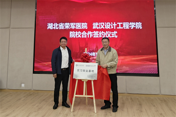 pp电子与湖北省荣军医院合作共建实习就业基地,学校校长、党委副书记龚少平(右)与湖北省荣军医院党委委员、副院长李华章(左)共同为“实习就业基地”揭牌。