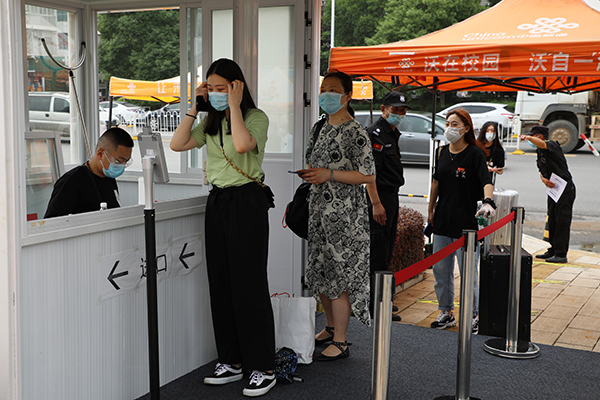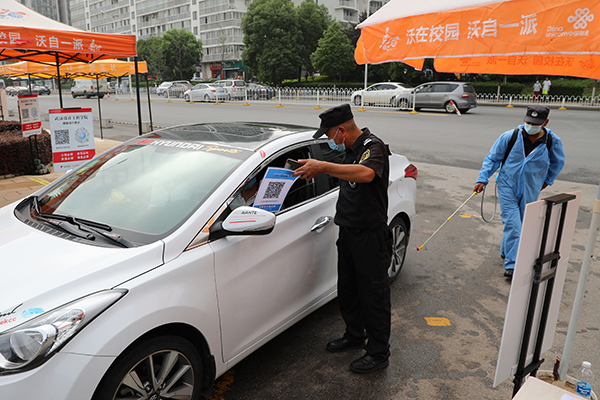 记者在校园看到,返校毕业生抵达学校后,现场工作人员立即引导同学们保持一米以上安全距离排队,查验健康码及核酸检测结果,有序通过专用通道。专用通道内安装有红外线测温设备,只需站在仪器前,便能自动获取学生的身份信息和体温值。同时,现场工作人员还会对学生的行李和私家车的外部进行消杀处理,保证不遗漏任何防疫细节。