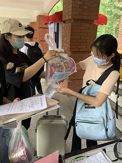 “同学们进宿舍以后,一定要先通风。收拾好个人物品,抓紧时间办理毕业手续。注意合理安排时间。”宿舍楼前,辅导员们一边向毕业生们讲解注意事项,一边发放“防疫爱心包”,引导大家再次登记信息、测量体温进入宿舍。