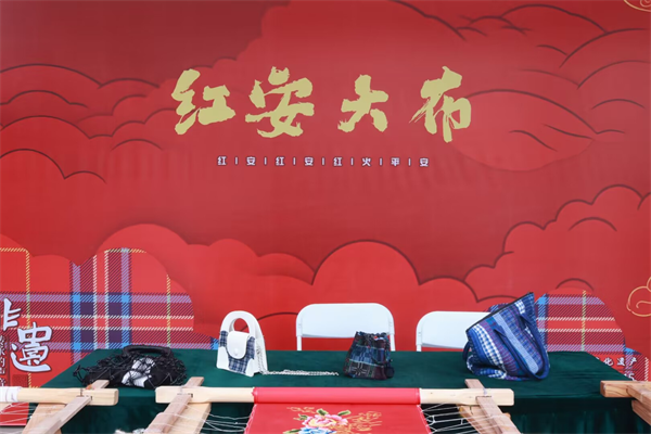 学校荆楚纺织非遗研究中心的荆楚纺织非遗工艺品在红安万星里广场精美亮相。