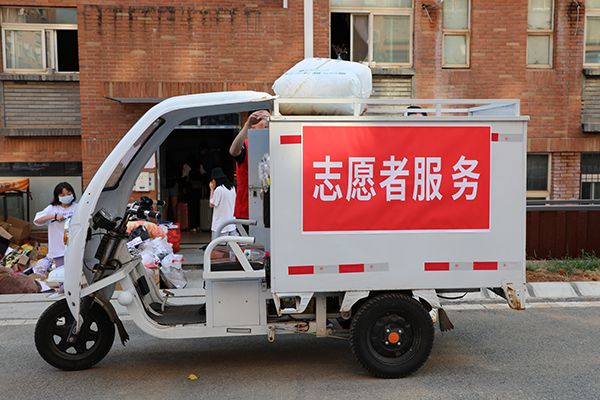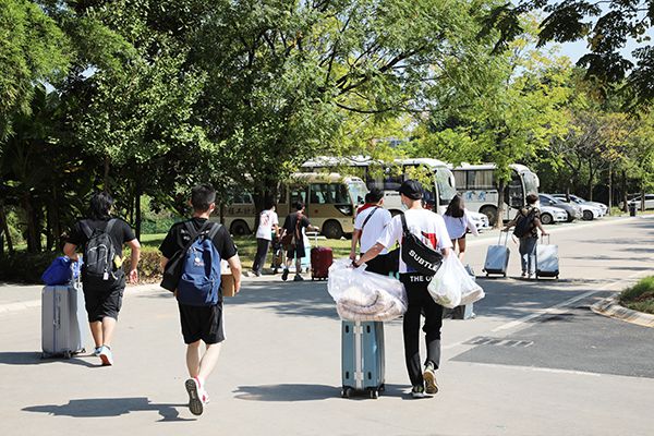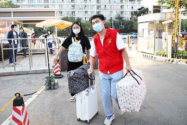 校园内实行封闭式管理,校外车辆和学生家长一律不能进入学校。看到行李较多的同学,“五色阳光”志愿者和保卫师傅连忙帮忙把行李送进宿舍楼。