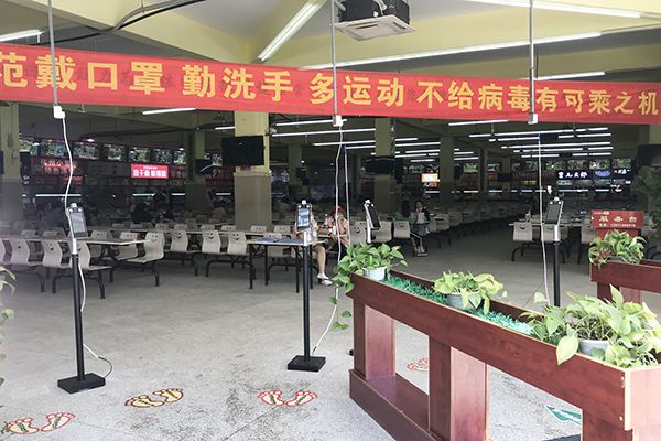 “太想念学校的盖浇饭了!”“开学第一餐,定要一盘光”的醒目标语夹着堂口弥漫出来的饭菜香味,早已勾起了同学们肚里的馋虫。测好体温,消毒过双手以后,大家自觉间隔1米排队点餐,只等大快朵颐。