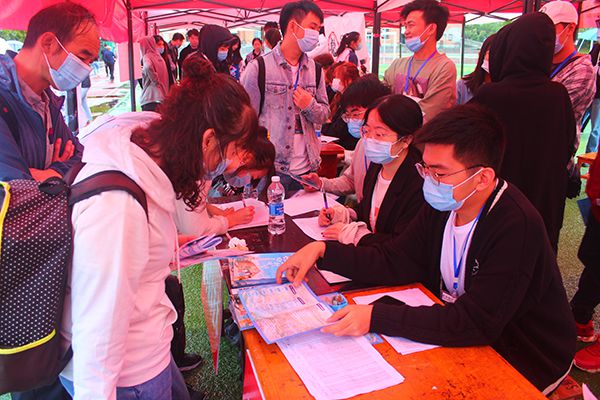 工作人员和志愿者为新同学提供细致入微的服务。黄高 摄