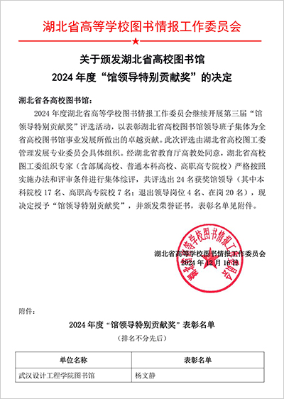 据了解,本次评选活动旨在表彰湖北省高校图书馆领导班子集体为全省高校图书馆事业发展所做出的卓越贡献,由湖北省高校图工委管理发展专业委员会具体组织,经湖北省教育厅高教处同意,湖北省高校图工委组织专家严格按照实施办法和评审条件进行集体综评,共评选出24名获奖馆领导,授予“馆领导特别贡献奖”。