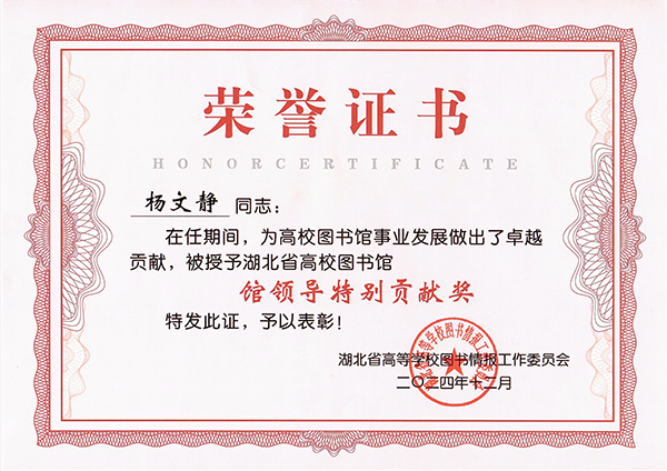 pp电子图书馆馆长杨文静获评湖北省高等学校图书馆2024年度“馆领导特别贡献奖”。