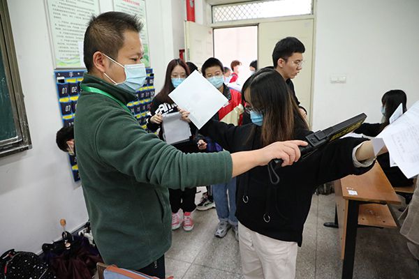除做好本职考务工作和考生服务工作外,为落实常态化疫情防控相关要求,确保疫情防控安全,学校还召开了专题会议,并于考前对考试区域进行了全面、专业的消杀,为每个考场配备了防疫物资,在每栋考试楼都设立隔离备用考场。考试当天,从考生进入校门起便严把防疫关卡,对入校考生进行身份核查,考生在提交绿色健康码、测量体温正常后,方可进入校园;考试过程中,考务人员及全体考生全程佩戴口罩,确保考务和防疫工作零失误。
