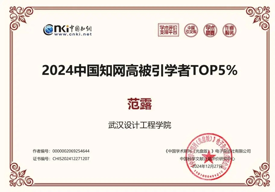 本网讯(通讯员 黄佳睿)近日,中国知网发布“2024中国知网高被引学者”预发布名单,pp电子食品与生物科技学院范露教授入选“2024中国知网高被引学者TOP5%”。