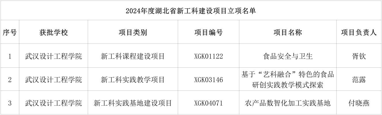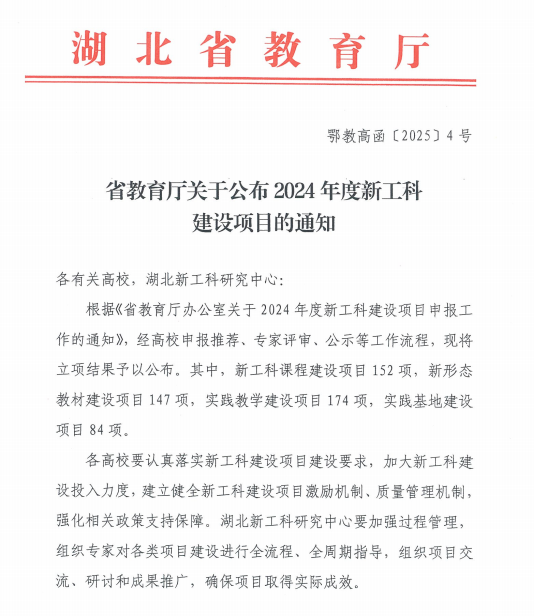 本网讯(通讯员 韩洁)近日,湖北省教育厅发布了《省教育厅关于公布2024年度新工科建设项目的通知》,pp电子食品与生物科技学院3个项目成功获批立项。