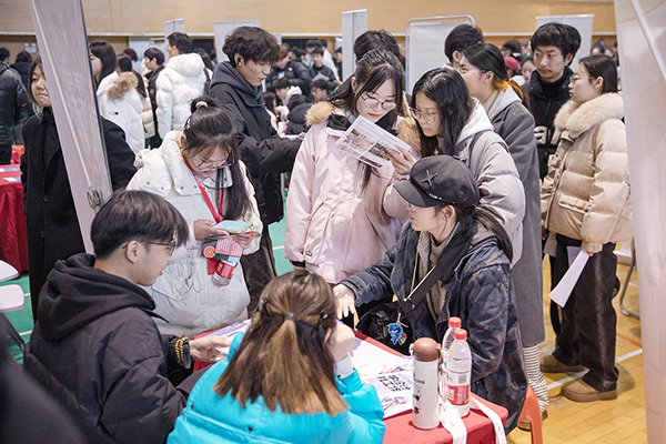 招聘会现场人头攒动,前来求职咨询的同学积极与用人单位工作人员交流咨询。郭文耀 摄