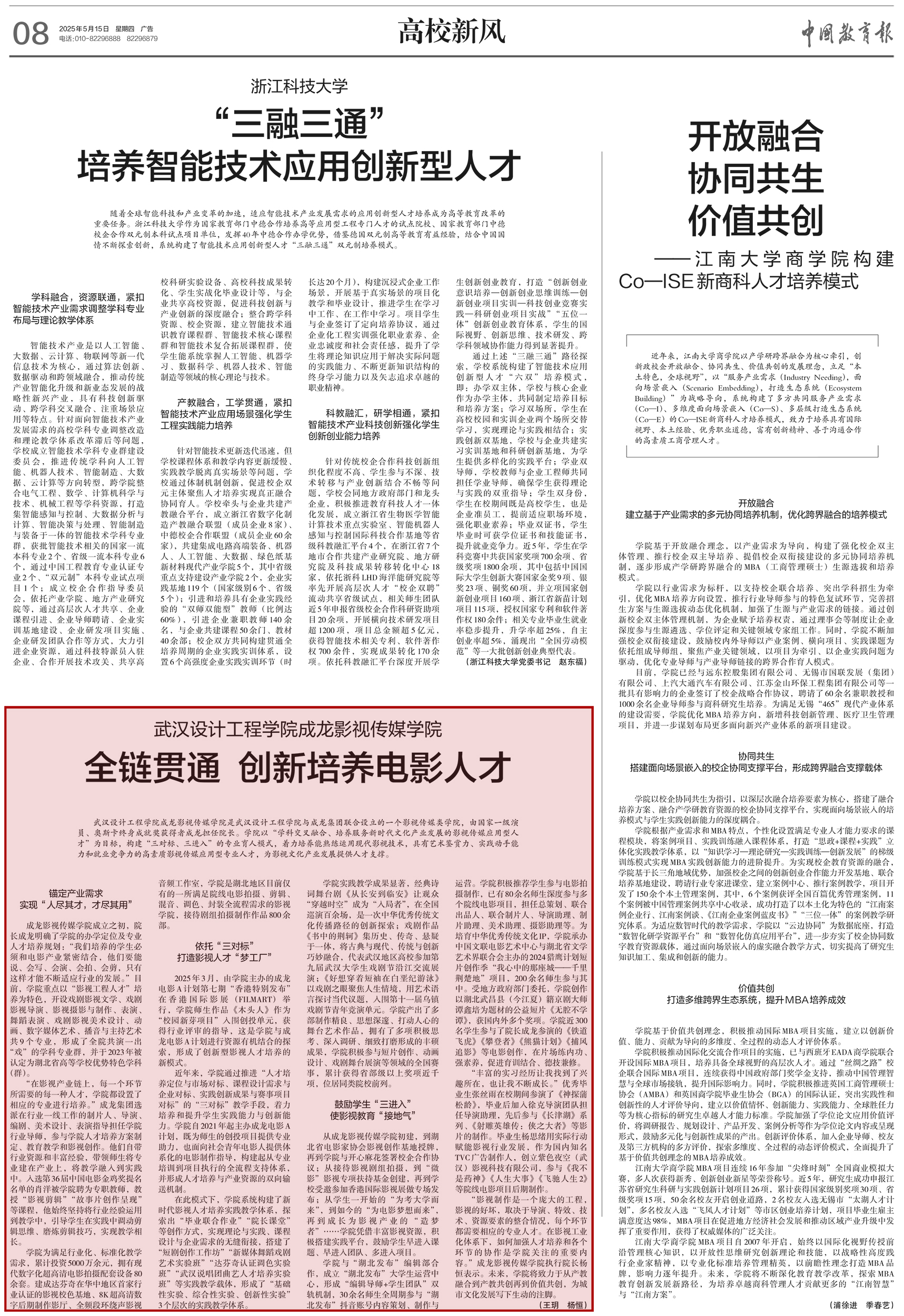 本网讯(通讯员 王玥 杨恒)5月15日,成龙影视传媒学院成立十周年之际,《中国教育报》“高校新风”版(第08版)以《pp电子官方网站成龙影视传媒学院:全链贯通,创新培育新时代电影人才》为题,深度报道了学院立足产业前沿,创新构建“三对标、三进入”育人模式,精准培养服务新时代文化产业需求的影视传媒应用型专业人才。