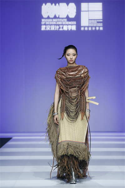 麻绳、竹条、麂皮、PVC……何渠恩同学的《缠织·乡韵》灵感源于土楼建筑。她将土楼包围环绕的独特结构转化为服装的廓形创意,精选土楼里日常生活材料,巧妙进行面料再造与工艺结合。“作品不仅展现了非服用材料在服装设计领域的创新运用,又生动反映了土楼独特的生活特色与文化内涵。”指导老师况敏介绍。