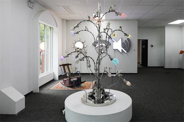 走进美术馆3号展厅,一件神似“青铜神树”的作品引人注目。“该作品名为《灵木花潮》,以三星堆‘青铜神树’为原型,通过传感器矩阵、计算机编程与人机交互技术,在数字维度彰显古蜀文明的神秘。”负责本次展览讲解的公共艺术专业2302班李彤昕同学向观众介绍,它在保留文物原始美学基因的同时,解构“博物馆橱窗”式的静态陈列逻辑,探索文化遗产在公共空间中的未来叙事。