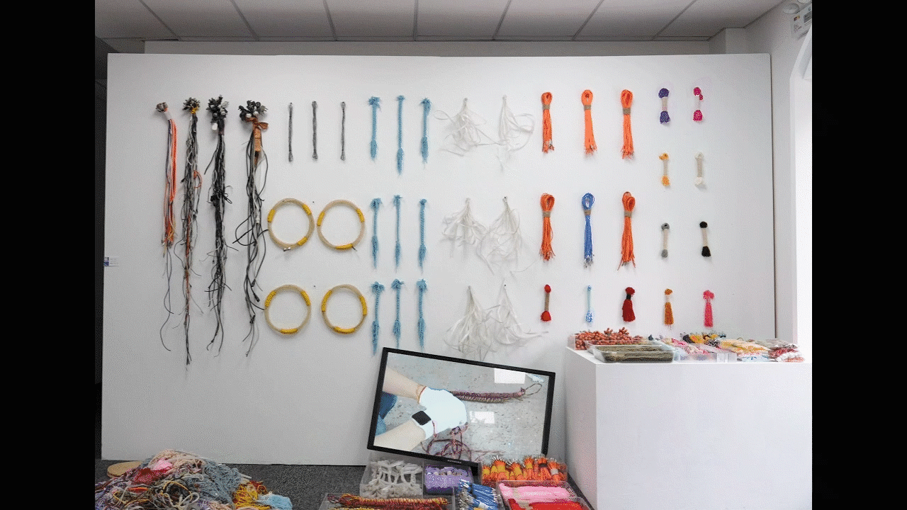 “我们每天都被各种选择环绕,每一个决定都在悄然改变着生活。”作品《择向》以象征导向的机械箭头为“主角”,通过15组箭头的动态演绎,解构人们时刻面临的“选择暴力”。当传感器捕捉到观众的衣着色相,便将色彩数据转化为箭头的运动参数,进而操纵群体方向,这种在红绿蓝光谱的交织中,个体无意识的选择与集体运动的轨迹,形成一种荒诞却又发人深省的映射。同样聚焦生活的还有作品《无绪》,围绕“理清杂乱的线”的创作过程,试图将混乱的各种“线”进行分类摆放,在有意识的“重复”中强化视觉冲击,引发人们对自我、对生命、对日常生活的思考。