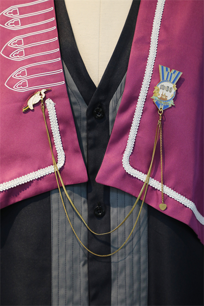 据了解,新版学位服为袍披挂式设计,分校领导服、导师服、学士服三种,每套学位服由学位袍、披肩、学位帽、徽章四部分组成。学位袍借鉴楚服“交领右衽”的形制特点,采用交领设计,前襟以绗缝明线搭配纽扣,兼顾仪式感与穿着便捷性。而饰白色滚边的披肩,呈斗篷样式,绣有荆楚云纹简化刺绣图案,边缘以流畅弧线收口,且以UV热转印工艺,将学校图书馆建筑廓形镌印其上,其形态与楚式深衣的灵动之美相呼应,打破了传统学位服的单调之感。