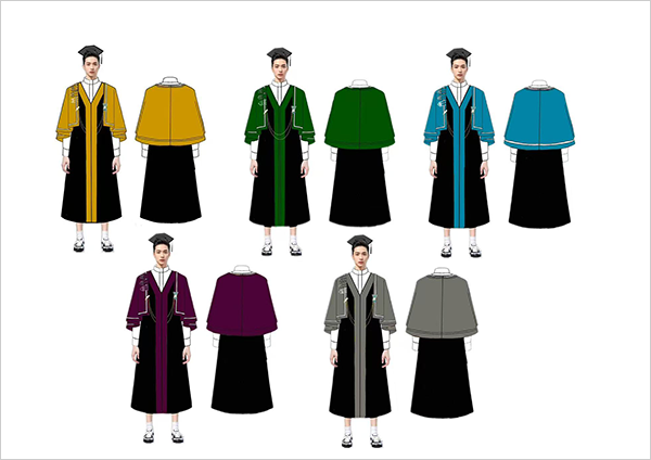“学位袍以荆楚文化中的藏青为主色调,喻示庄重与神秘,与学位服所承载的学术象征意义相契合。至于披肩,各学科对应颜色各不相同,文学学科披肩为缬草紫,工学学科是绢纨黄,农学学科为苍莨绿,理学学科是月魄灰,医学学科为青冥蓝。”张勇称,学位服在色彩搭配方面,借鉴楚漆器的五彩间色,同时适度融入深灰进行点缀,既体现荆楚工艺的华丽特质,亦符合现代审美趋势,庄重而不失时尚感。