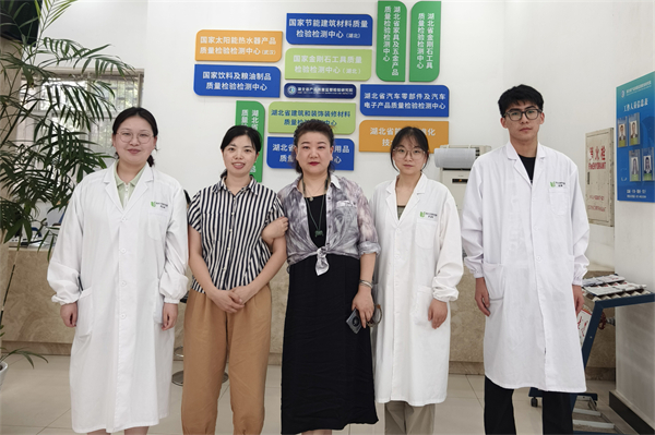 张腾(右一)、万荣誉(右二)在湖北省产品质量监督检验研究院与实习指导老师合影。