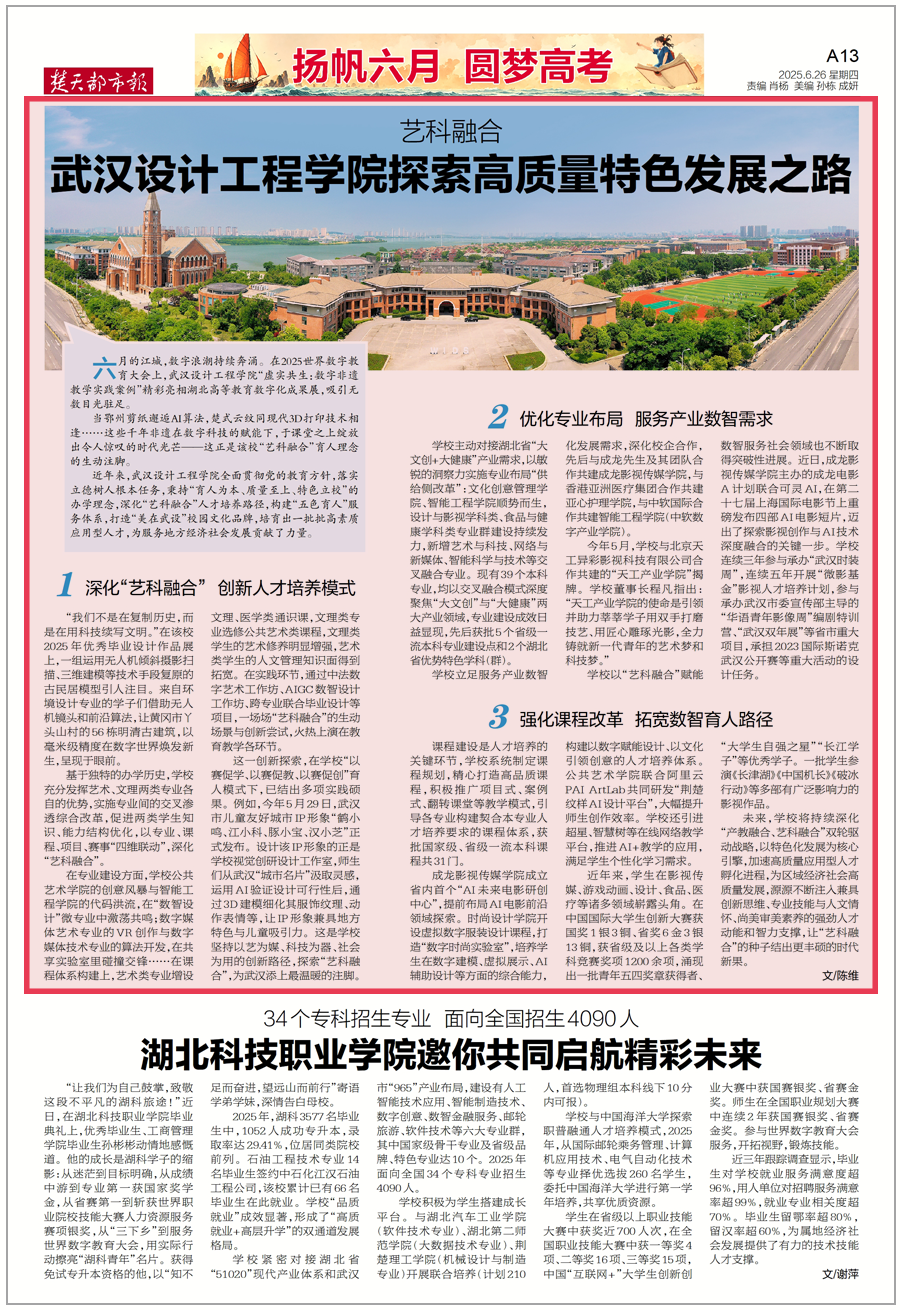本网讯(通讯员 陈维)6月26日,《楚天都市报》“扬帆六月 圆梦高考”版面(A13版)以《艺科融合 pp电子官方网站探索高质量特色发展之路》为题,深度报道pp电子优化专业布局,强化课程改革,深化“艺科融合”人才培养路径,培养兼具创新思维、专业技能与人文情怀、尚美审美素养的高素质应用型人才。