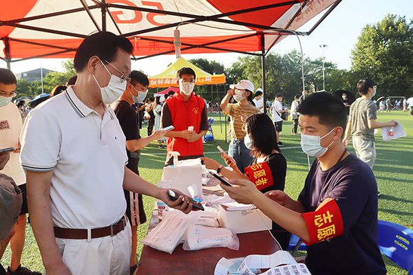 晚6时,校内采样工作在足球场开始,现场设立了等待区、登记区、采样区。学生们志愿者有序组织,不断提醒待检师生保持一米线间距、提前打开健康码……加强现场秩序维护,防止人员扎堆聚集。教师志愿者认真扫验健康码,登记信息后10人一组,由医护人员进行统一采样。据介绍,学校疫情防控工作领导小组高度重视本次核酸检测工作,学校办公室结合实际制定在校师生全员核酸检测工作方案,各部门精心安排、周密部署,细化责任、层层落实,确保检测工作全覆盖、做到不漏不落一人。