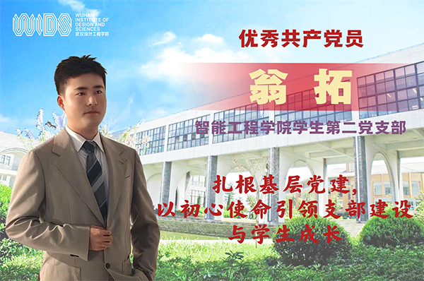 翁拓,智能工程学院学生第二党支部书记、专职辅导员。他扎根基层党建岗位3年,以“为党育人、为国育才”为使命,在各方面发挥先锋模范作用。获学校优秀政工干部、优秀共青团干部、就业工作先进个人、优秀辅导员、寒假社会实践“优秀指导教师”等荣誉称号。