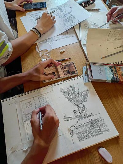 “基础写生是学校根据教学计划开设的一门专业基础课程,也是实践教学的重要环节。”据教务处实践教学科程凤老师介绍,通过外出写生,能够帮助学生开拓视野、提高绘画水平、启发创意设计灵感,为后续专业课的学习奠定基础。”