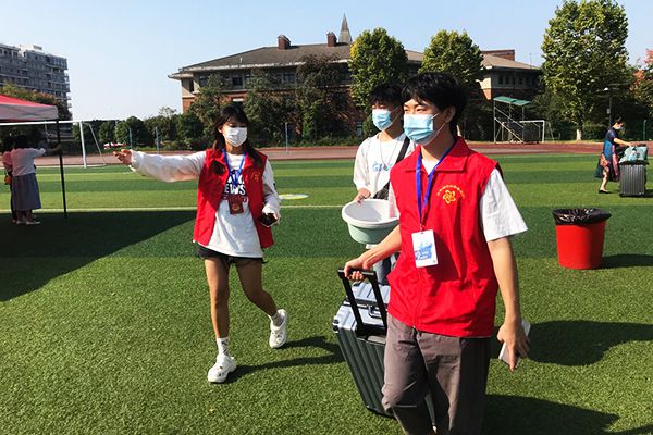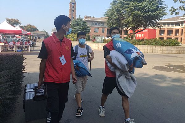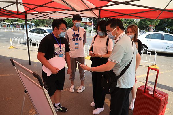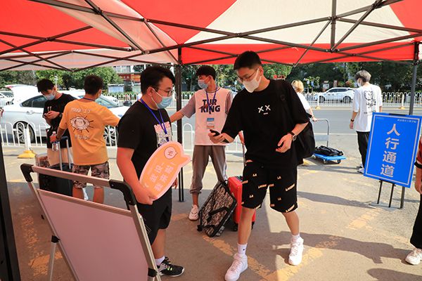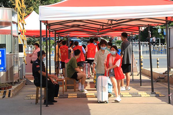 “同学你好!请戴好口罩。”“你好,请出示行程码。”后勤保障处、保卫处工作人员和各单位志愿者手持额温枪,为进校新生一一测量体温、核查健康信息、引导人车分流,严格执行防控防疫措施,把好入校第一关。