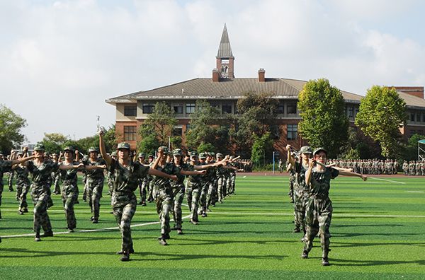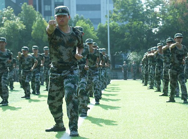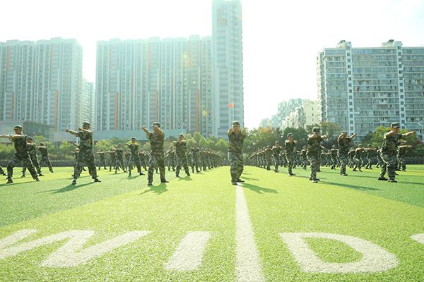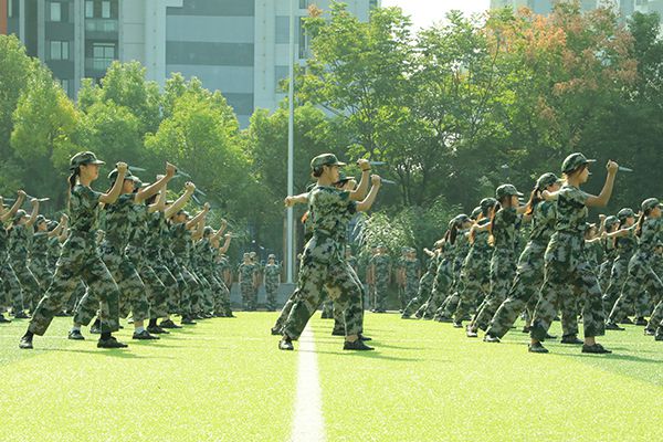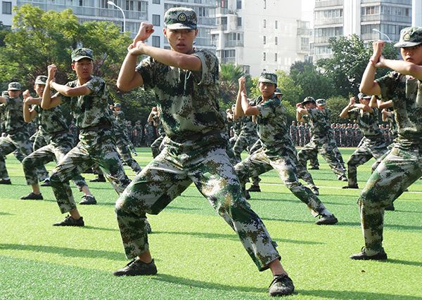 在军训旅旅长雷震的指挥下,首先进行了男子军体拳和女子匕首操汇报表演。男子军体拳气势如虹,一拳一掌、动作有力,一招一式、张弛有度;女子匕首操 “杀”声阵阵,英姿飒爽、柔中带刚、铿锵有力,巾帼不让须眉。