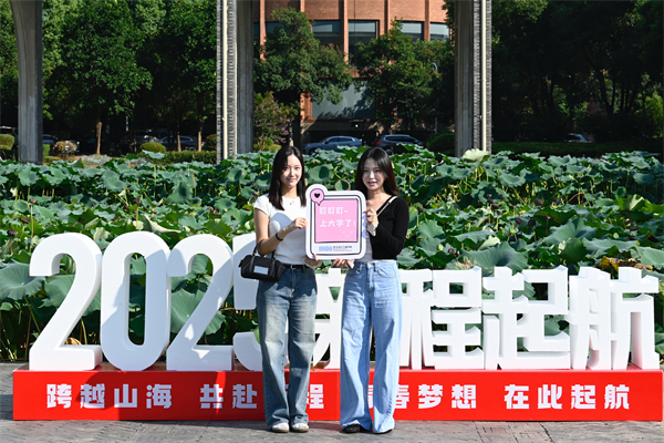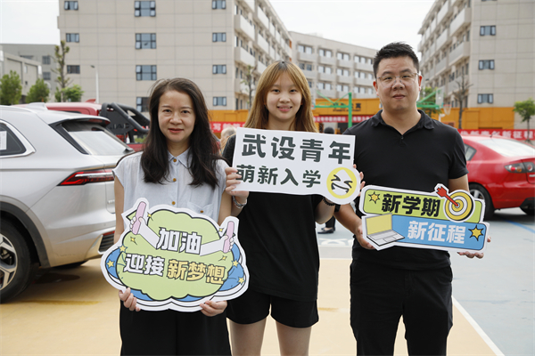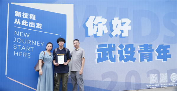武汉校区得一堂广场上,一座印有“热烈欢迎新同学”的巨型桁架成为新生打卡的“C位担当”。桁架上,醒目的欢迎标语与学校标志性建筑剪影相映成趣,喜庆而大气,不少新生以此为背景比出“耶”的俏皮手势,或手持花式道具与亲朋好友合影留念,仪式感直接拉满屏幕。也有不少家长在此与孩子留下温馨的全家福。