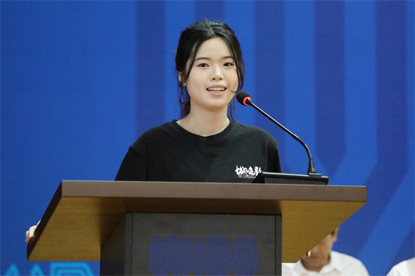 在校生代表、国家奖学金获得者、成龙影视传媒学院2022级影视摄影与制作专业的陆欣怡,分享了自己在校期间参与电影《捕风追影》拍摄、投身志愿服务的实践感悟。“武设,是一座追寻美的‘梦工厂’。”“是为我们点燃星光、助我们坚定奔跑的地方。”她希望学弟学妹们在武设大胆追寻美、创造美,探索属于自己的天地,珍惜时光、心怀热爱,探索不息、超越不止,以持续奋斗和卓越追求,书写无愧于时代的青春答卷。