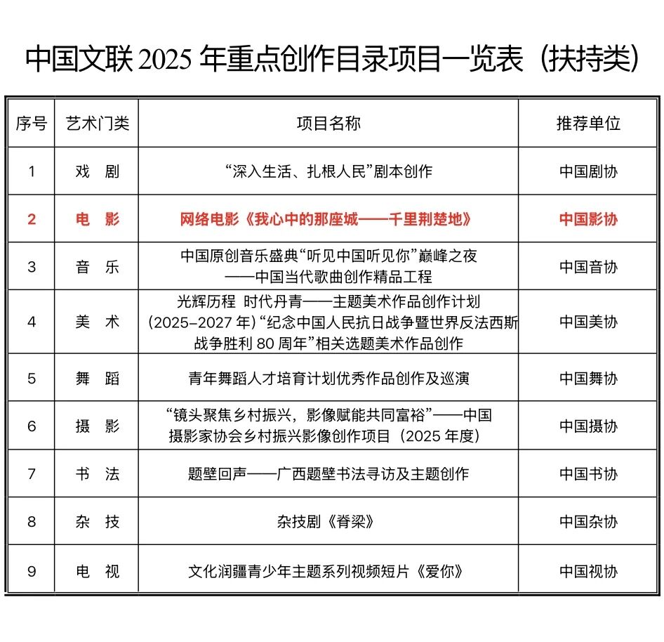 本网讯 近日,中国文联公布2025年度重点创作目录项目,共25项,其中扶持类项目9项,支持类项目16项。由成龙影视传媒学院承办的《我心中的那座城——千里荆楚地》电影项目成功入选中国文联2025年重点创作项目(扶持类)。