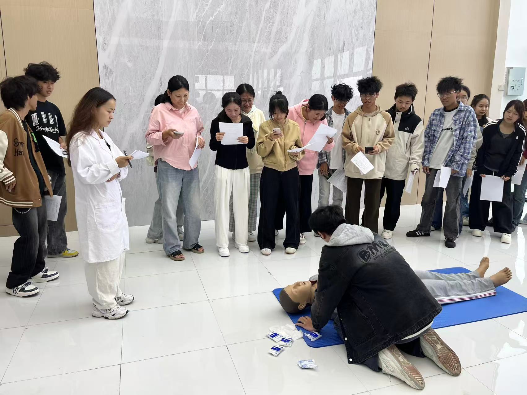 实操训练则是培训中最具活力的环节,现场气氛热烈。在培训老师的悉心指导与示范下,同学们迅速投入练习:分组用模拟人反复练习心肺复苏的按压位置、深度、频率及人工呼吸技巧;两人搭档模拟演练海姆立克急救法的站位与冲击动作;手持绷带,逐一操练环形、螺旋形、“8”字包扎等基础技术。与此同时,培训老师穿梭在各小组之间,手把手纠正同学们的不规范动作,耐心解答同学们在操作过程中遇到的各类问题。