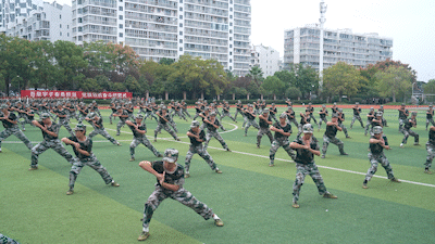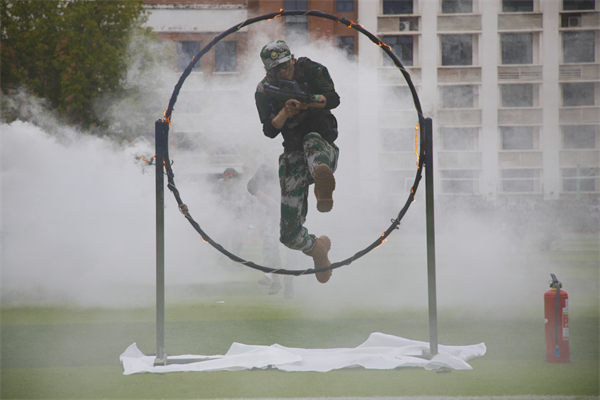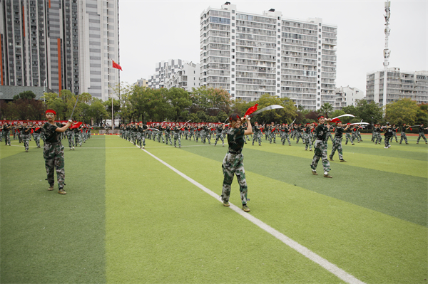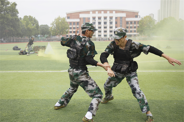 学生军事训练特色科目展示现场高潮迭起,女子匕首操、男子军体拳、女子破锋八刀和模拟战术表演轮番上演。“杀!杀!杀!”女子方阵率先登场,她们头缠红巾,手握匕首,眼神坚毅,弓步前刺,快且精准;转身斜劈,凌厉生风,一招一式,刚毅果敢。紧接着,男子军体拳霸气开打,弓步冲拳,迅猛刚劲;穿喉弹踢,直击要害;马步横打,势大力沉,尽显铁血风采。转瞬间,女子破锋八刀轰然“杀出”,“铿锵玫瑰”们步态坚实,出刀迅猛、收刀利落,刀影闪烁间飒爽豪迈,引得场外喝彩声不断。