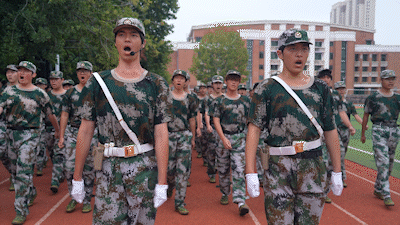 “迎军旗!”“标兵就位!”学生军训分列式开始。各方阵以整齐划一、铿锵有力的步伐稳健前行,如钢铁洪流般行进至主席台前接受检阅。他们身姿挺拔,昂首挺胸,目光如炬,坚毅与果敢的神情中透着青春独有的蓬勃朝气,每一步都踏出青春的磅礴力量,彰显着新时代青年的风采与担当。领导们立于观礼台上,神情专注而严肃,目光中满是肯定与期许。