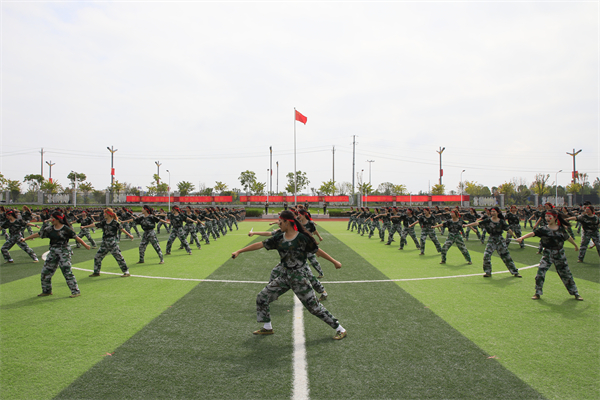在学生军事训练特色科目展示和分列式环节,激情与热血肆意迸发,现场气氛热烈。“强国有我,请党放心!”男子军体拳方阵率先霸气登场。弓步冲拳似雷霆出击,穿喉弹踢如蛟龙摆尾,马步横打间,刚猛之力喷薄而出,虎虎生风、气势如虹。紧接着女子匕首操闪亮亮相,同学们弓步突刺,快如闪电、直取目标,回身横划,遒劲果敢、利落飒爽,缠腕夺刀,身姿轻盈、柔中带刚,尽绽巾帼豪情。“迎军旗!”“标兵就位!”伴随嘹亮的口号,各方阵以整齐划一、铿锵有力的步伐迈向主席台接受检阅。他们身形笔直,目光坚毅,青春的蓬勃朝气与无畏的勇气交织,尽显新时代青年风采。