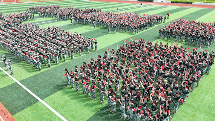 红安校区2025级新生开学典礼暨军训总结表彰大会现场,全体师生挥舞国旗,齐声高唱《我和我的祖国》。