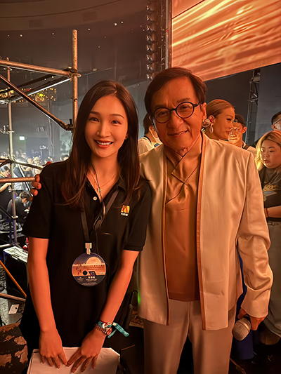 成龙影视传媒学院院长成龙与教师杜练合影。