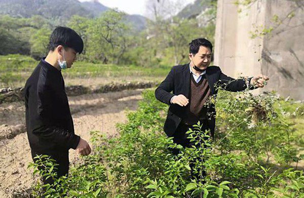 pp电子官方网站扶贫工作队队长尹保松(右一)查看种植基地。