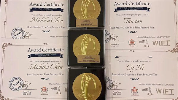据了解,塞浦路斯国际电影节由希腊和塞浦路斯文化部联合主办,旨在支持电影导演创作首部短片或故事片,通过多类别竞赛单元推动国际电影文化交流,促进电影艺术创新发展。本届电影节共收到来自全球52个国家的众多优秀作品。经过激烈角逐,《祈愿》成功入围阿芙洛狄忒奖主竞赛单元,并最终斩获首作最佳剧本奖、首作最佳导演奖和最佳原创音乐奖三项重要奖项。