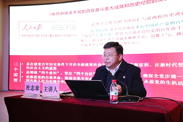 湖北省委讲师团成员、华中科技大学华中智库副院长、国家治理研究院副院长、马克思主义学院教授杜志章来校宣讲党的十九届六中全会精神。刘恒 摄