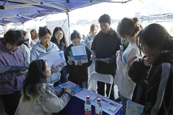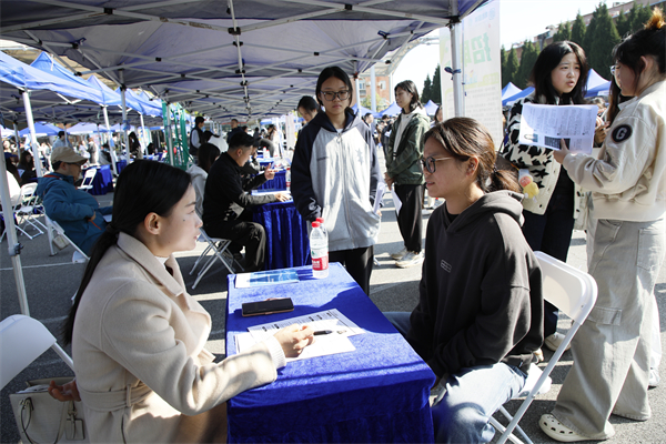 招聘会现场,毕业生积极与企业沟通,招聘工作人员耐心解答学生求职咨询问题。刘恒 张曦晨 摄