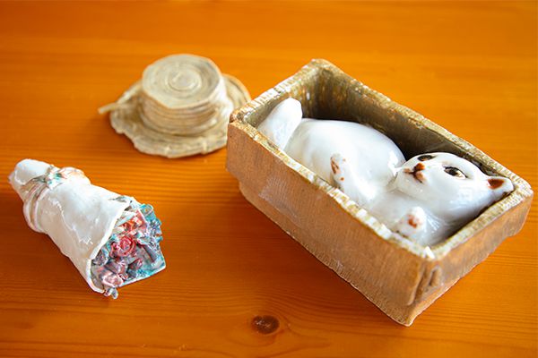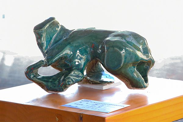 泥与水的凝合,釉料与烈火的升华。二等奖作品《如黛》、《花与猫》也吸引了不少观众前来观赏。据《如黛》的创作者谢玲子介绍,“作品原型是石膏鹿,创作上运用残缺感的外形,呼吁人们保护动物,珍惜眼前的美。”