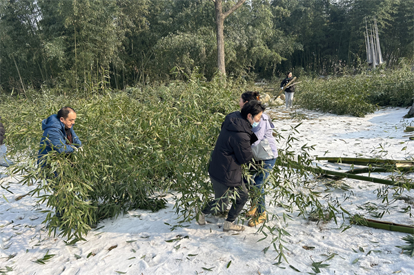 王明明(右二)带领后勤员工清理被积雪压倒的竹子。
