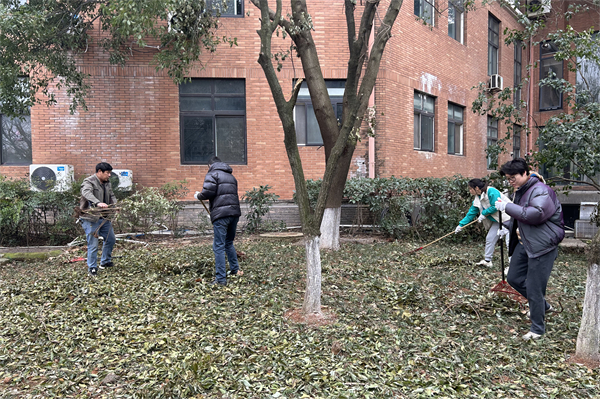 王明明(右一)带领后勤员工清理校园环境。