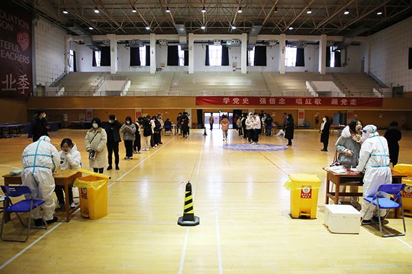 省外返校师生核酸检测采样工作在大学生活动中心二楼有序开展。