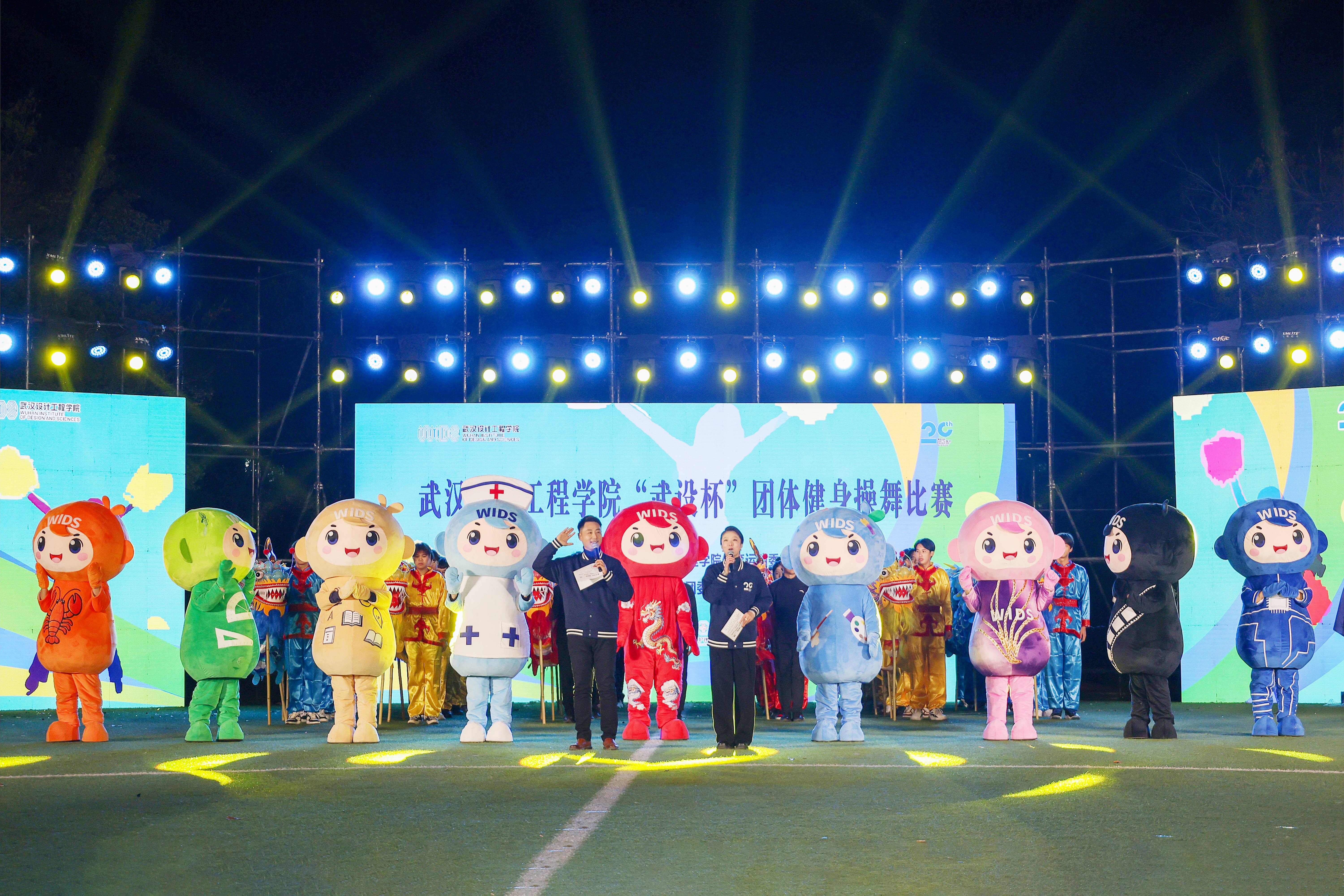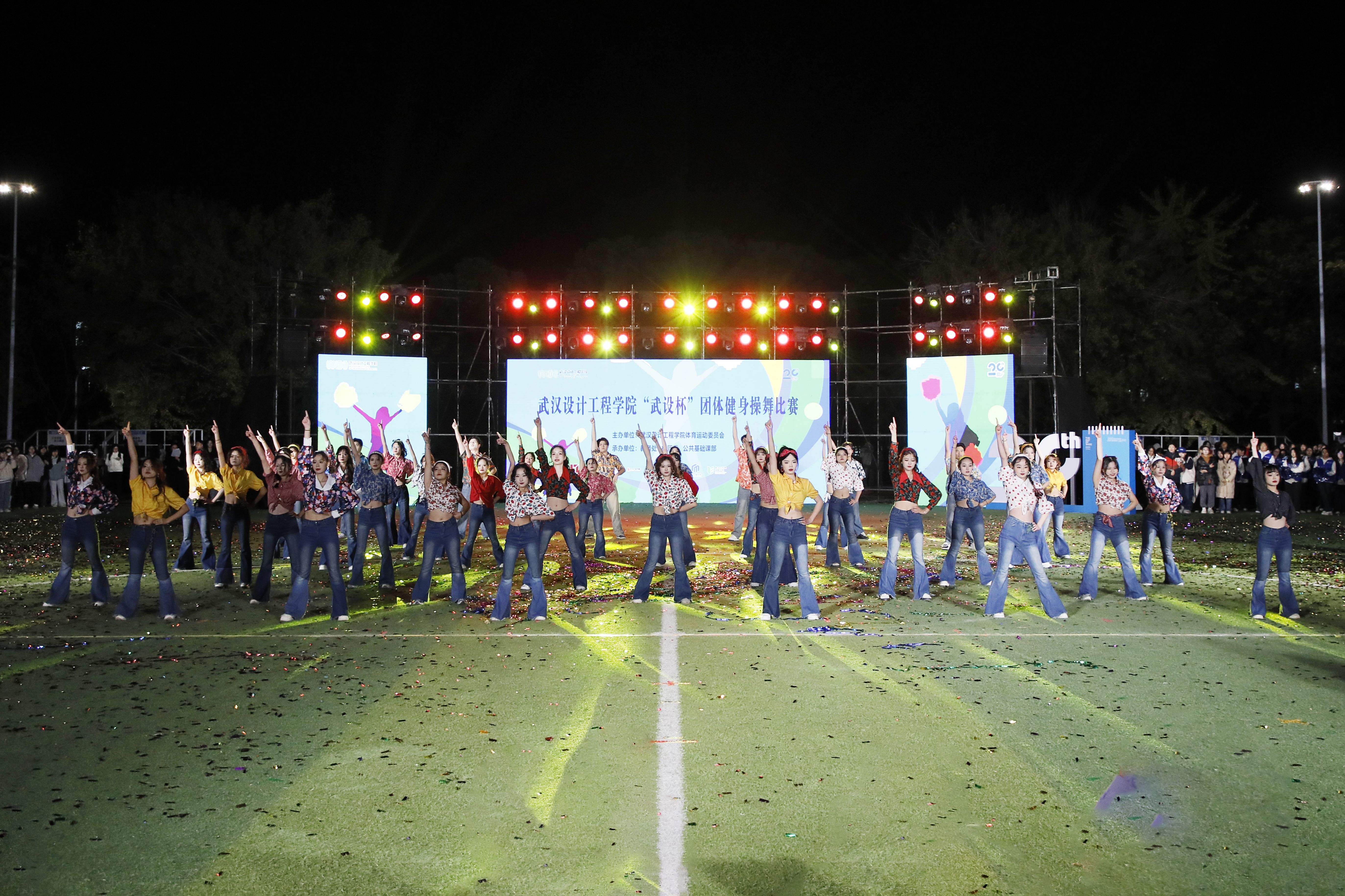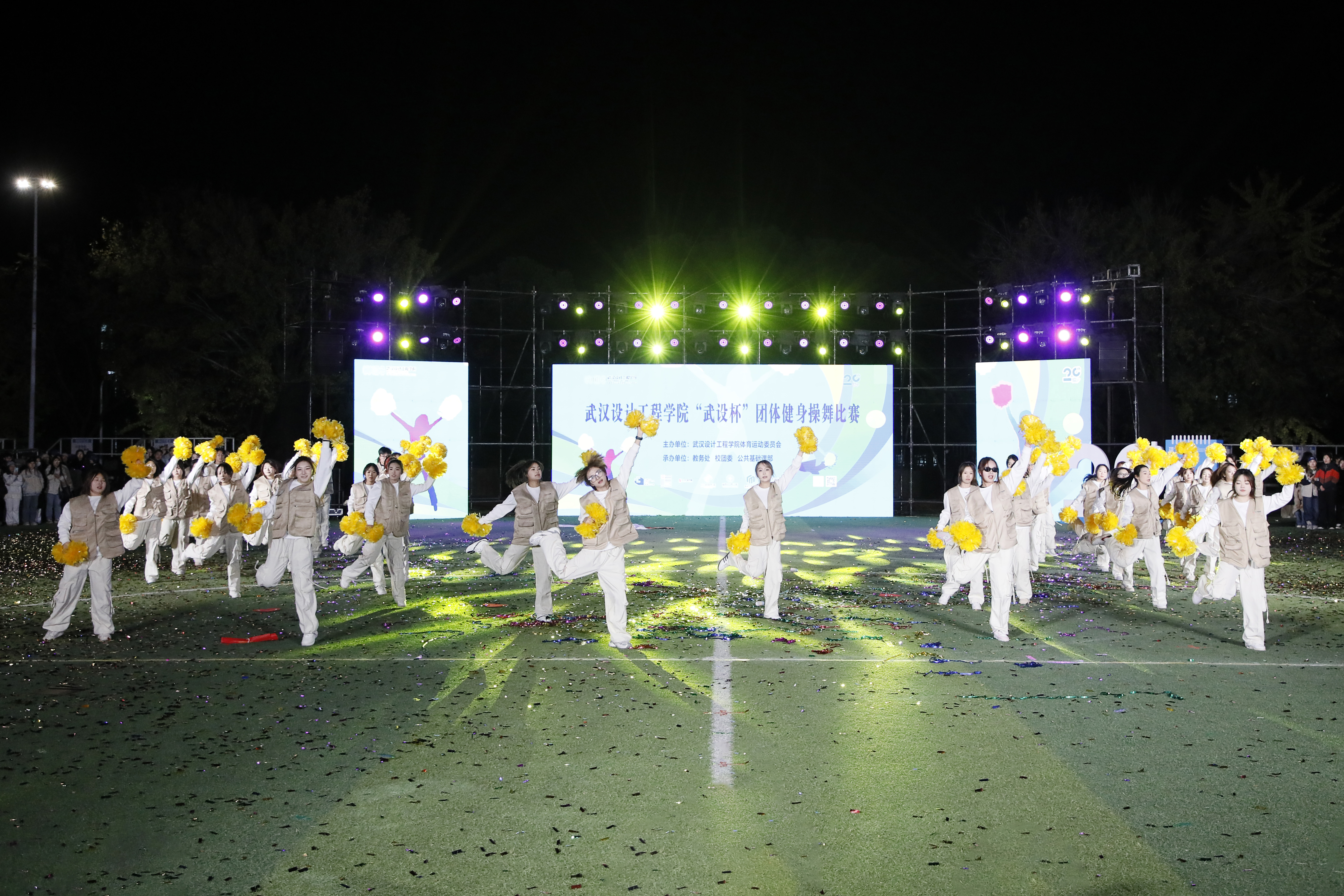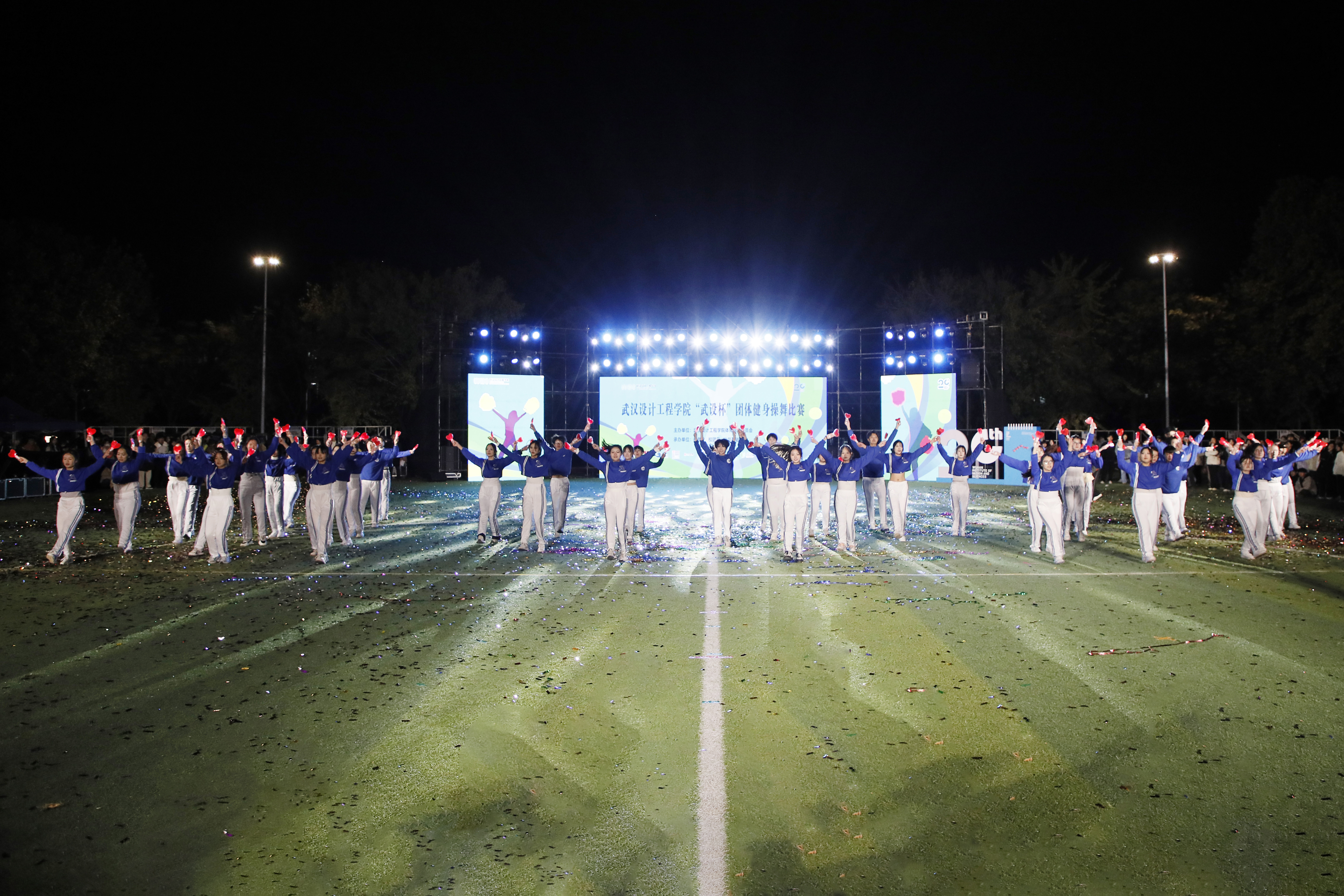 在缤纷飞舞的彩带辉映下,来自各学院的七支健身操舞队依次惊艳登台。他们以特色表演与精心设计的横幅展板,深情传递对学校的诚挚祝福,为建校二十周年献礼。现场气氛炽热,尽显团结奋进之姿。