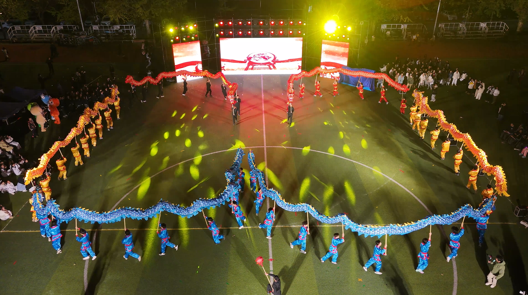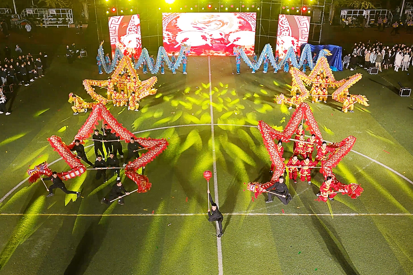 18时整,庄严肃穆的升旗仪式之后,六条威风凛凛的彩色长龙飞驰而出,在校武术队队员的激昂舞动下,时而腾云驾雾,时而盘旋嬉戏。令人惊喜的是,校领导亲身执龙掌舵、领航引路,与学子们一同欢舞,尽显“龙跃武设”的体育精神,展现师生同心的奋进姿态与精神风貌。