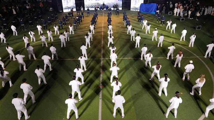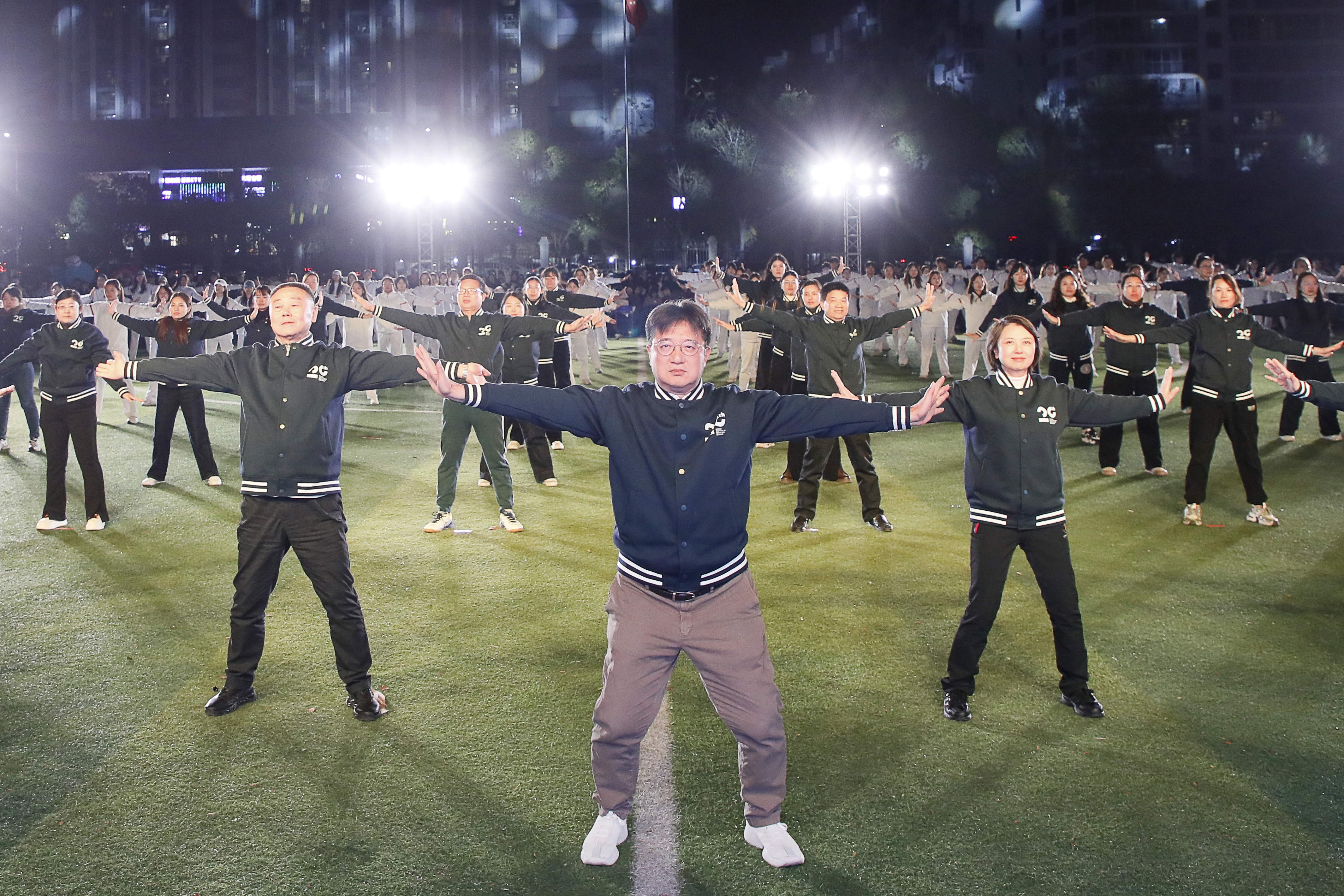 舞台场景悄然转换,校领导与全体师生共同演练刚柔并济的“八段锦”,师者蓝衫沉稳如海,学子白衣朝气如云,一招一式、一呼一吸,在“动静结合”的体育哲学中,传递出“修身立德”的育人初心。