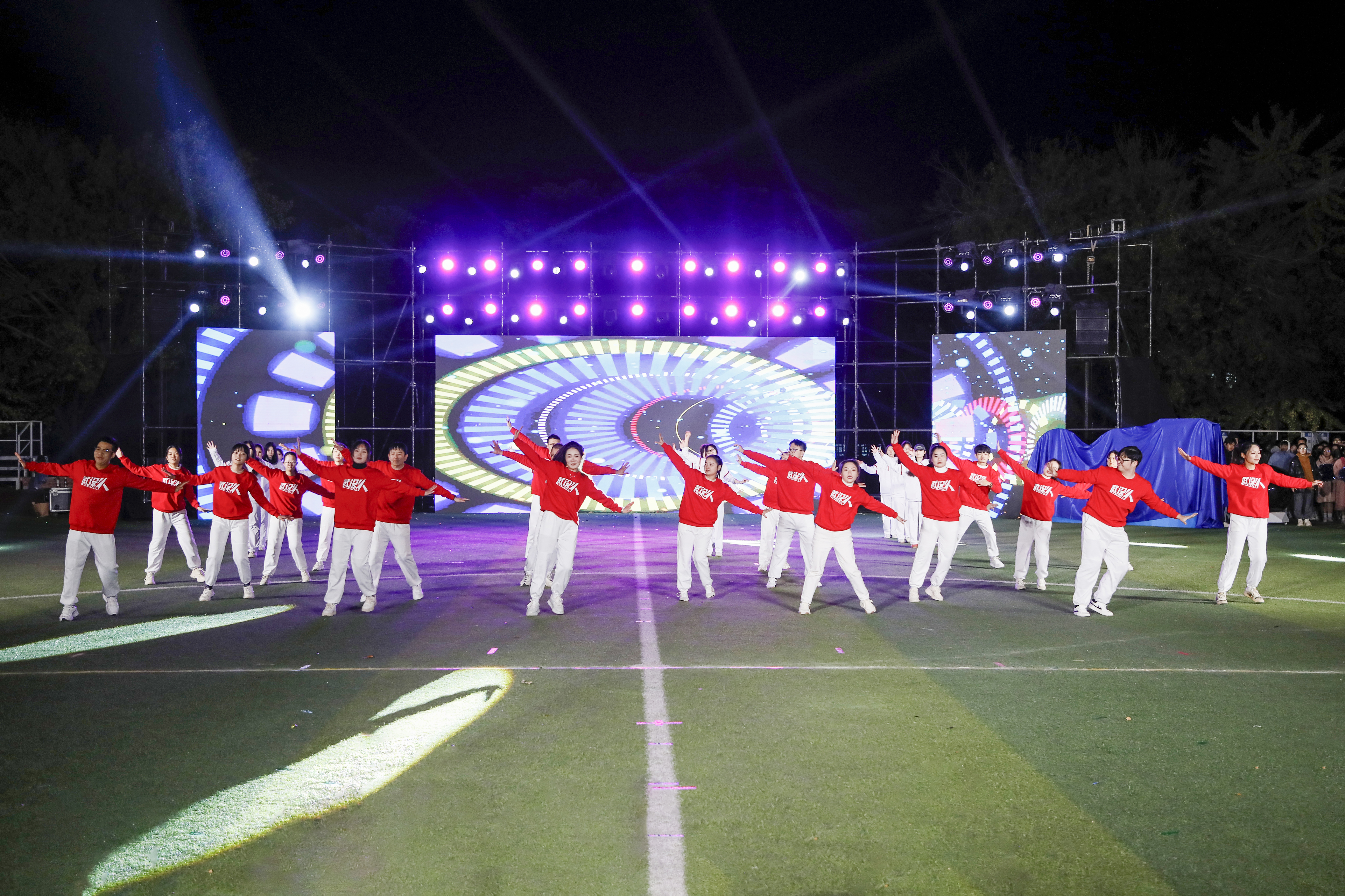 聚光灯下,“橙色活力迸发、白色优雅律动、红色热情似火”校舞蹈队、啦啦操队、体育舞蹈队轮番上场,共同演绎《三舞同心》,在夜幕中共同谱写青春与活力的交响乐章。