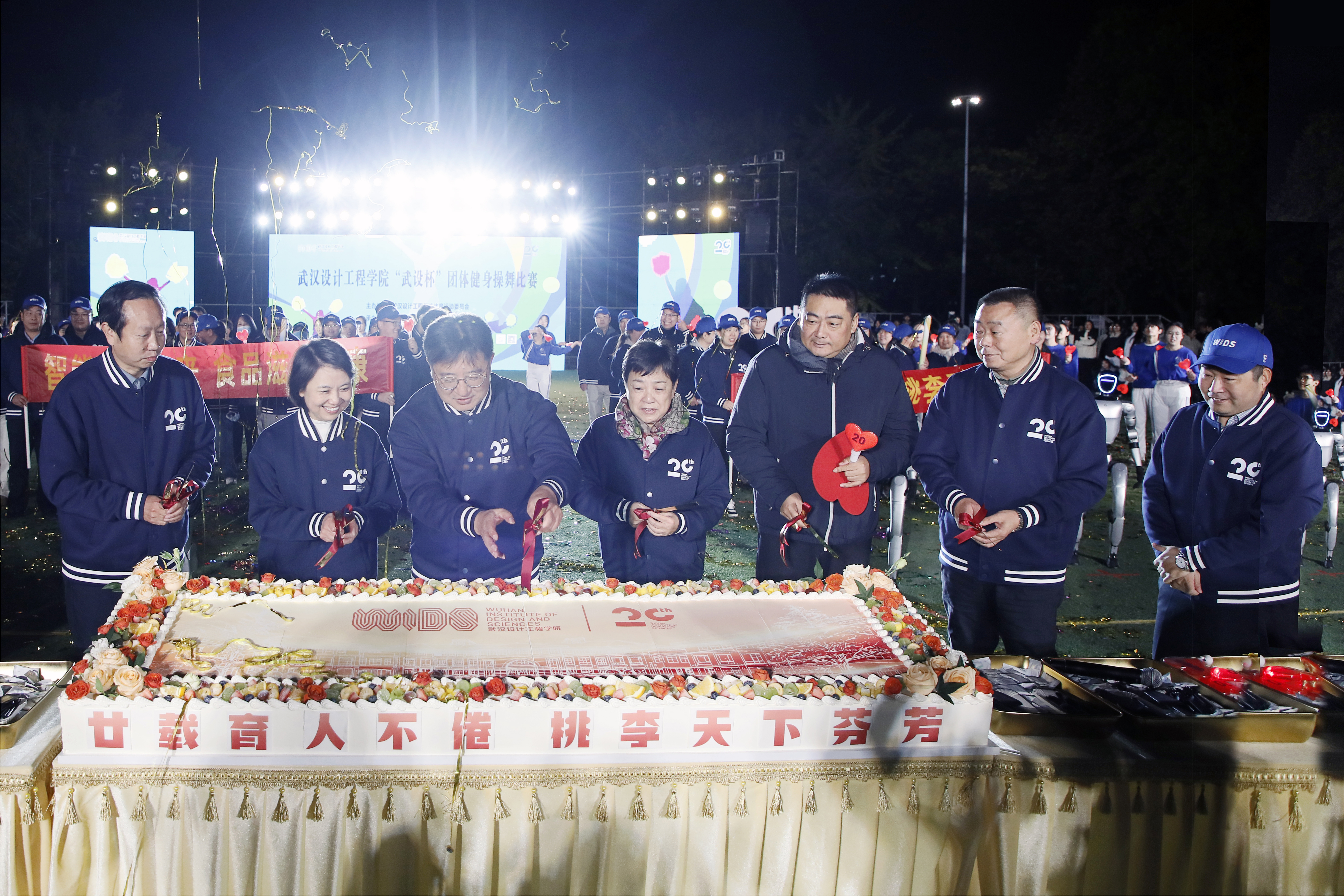 在《生日快乐》钢琴旋律中,由食品与生物科技学院打造的,象征学校二十周年的纪念蛋糕被缓缓推至场地中央,校领导与师生代表移步蛋糕台前,共同切分蛋糕,分享这份喜悦。“5、4、3、2、1!”在场师生齐声倒数,主舞台大屏上巨大的“20”字样绚烂定格。这一刻,掌声、欢呼声、祝福声交织成一片情感的海洋,师生共同高呼:pp电子官方网站二十岁生日快乐!基业长青,再启华章!